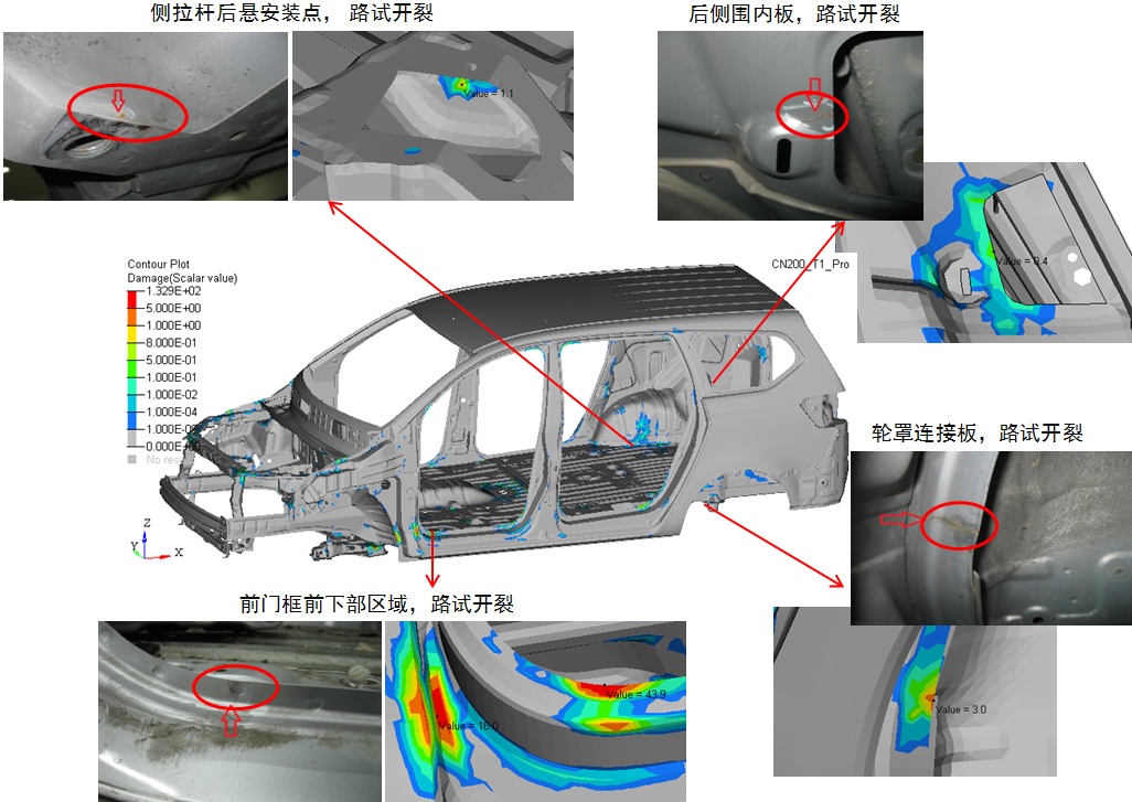 基于实测动态载荷路谱提取的动态载荷计算底盘和车身的疲劳分析与实车路试的结果高度吻合。