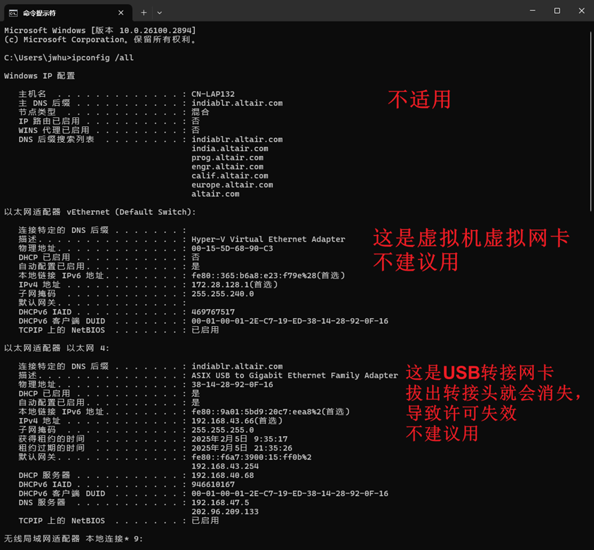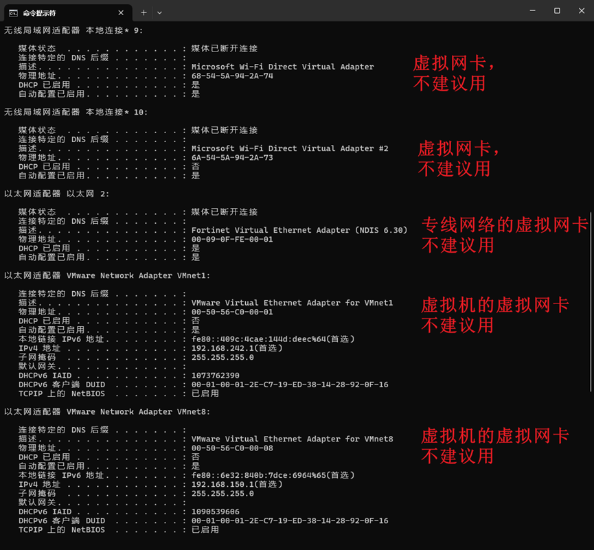 注意不同电脑返回的信息可能不同,下面图片中标注了一些常见的网卡信息,推荐使用机器自带的物理网卡的MAC地址,包含以太网、WIFI、蓝牙等,尽量避免使用虚拟网卡地址,也避免使用转接头的网卡地址。