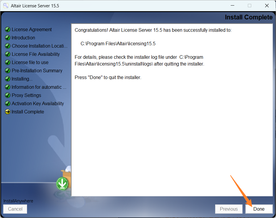 安装完成的汇总页。点击Done退出即可。此时可以发现,开始菜单下,已经生成了Altair 2025软件快捷方式,如下图。此时若打开软件,会提示许可错误,下一章,将介绍如何进行许可授权。