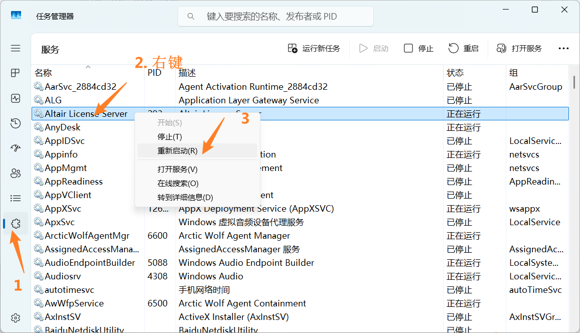 拷贝许可文件后,还需要重启Altair License Server服务项,打开任务管理器,切换到服务页,找到其中的Altair License Server项,右键-重新启动即可。